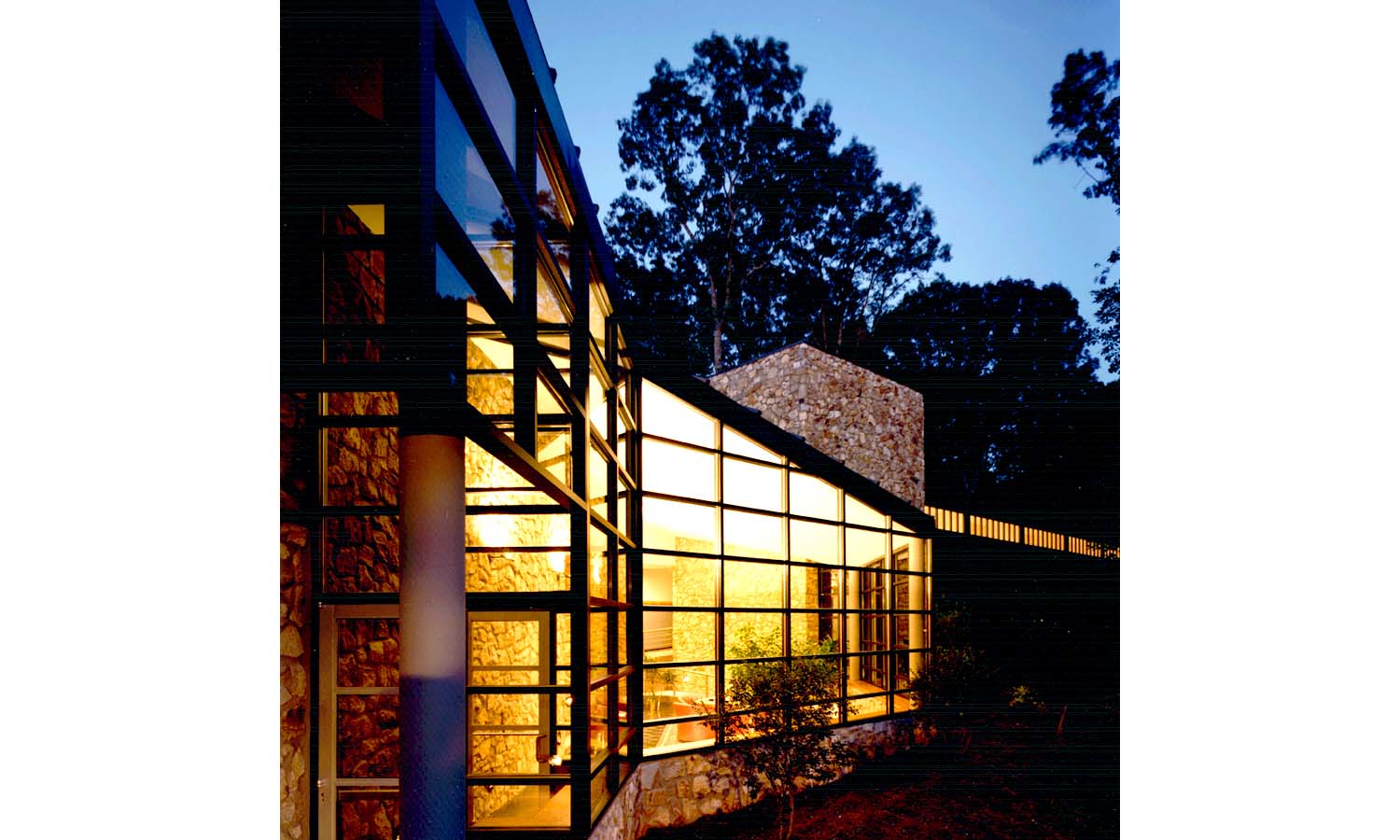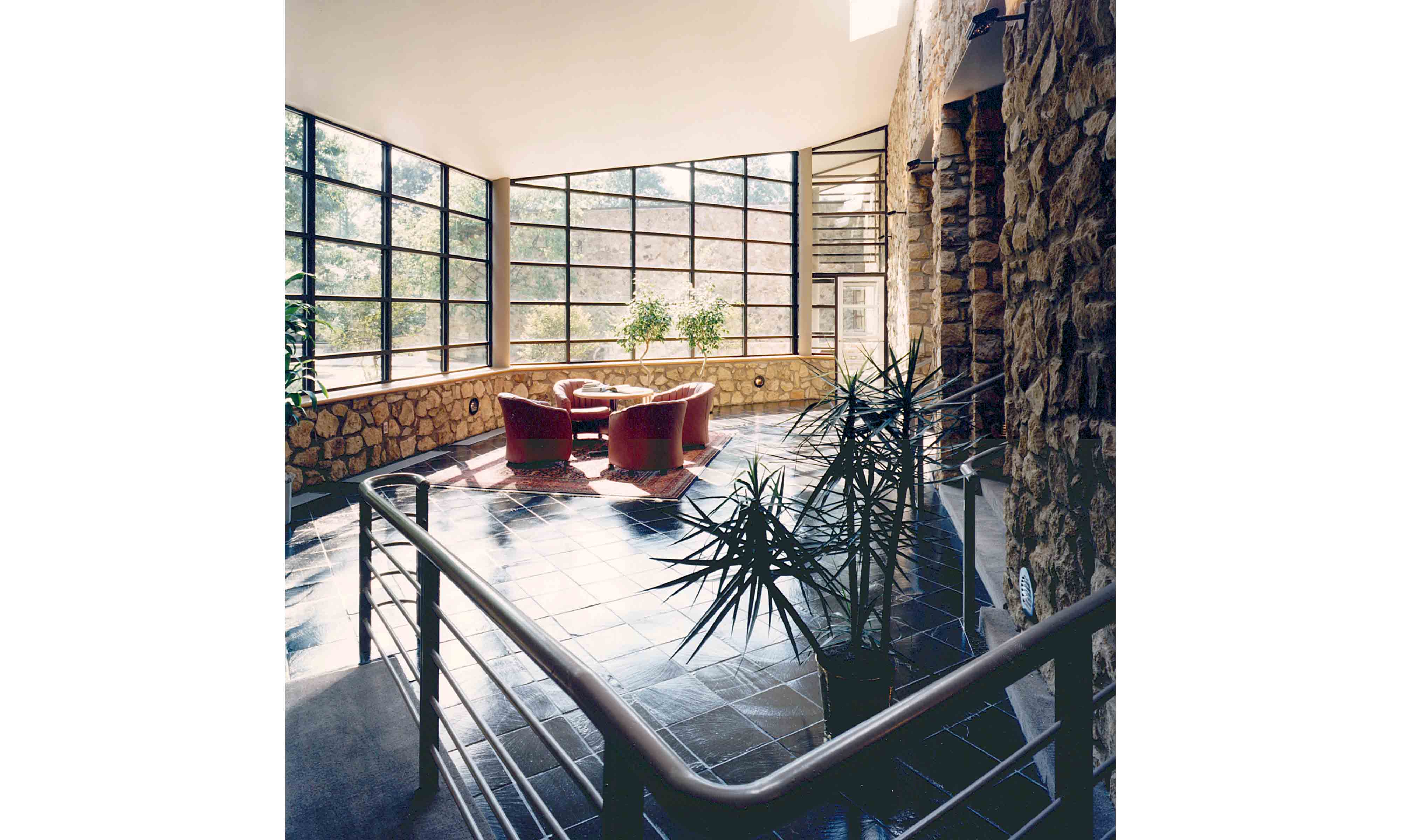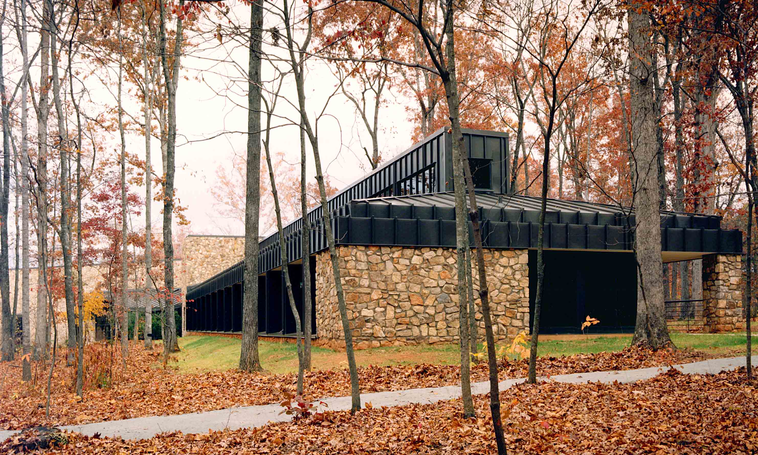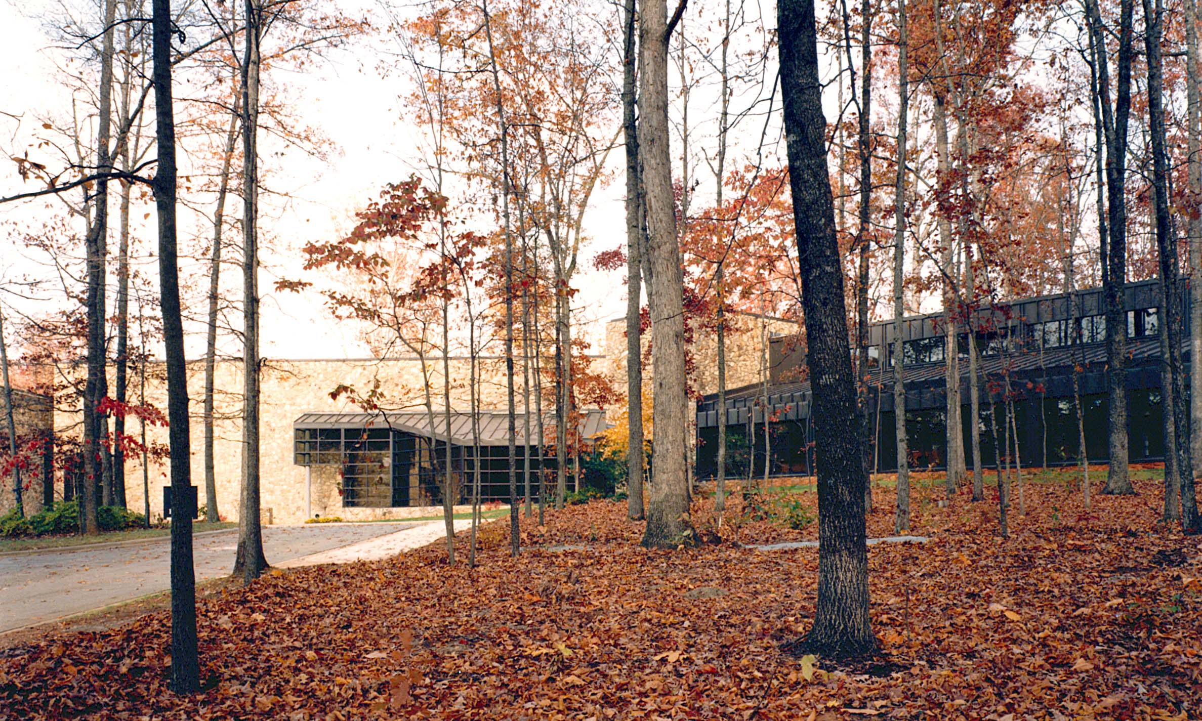 Since the behavioral laboratories and training room are not programmatically allowed to have natural light in them, the walls were constructed of stone matching that of the existing facility. To offer relief from these windowless spaces and to take advantage of a beautiful wooded site, break areas were provided in atrium like, glassed-in areas. The offices either wrap around the windowless spaces or are located in a wing that reaches into the woods between trees. This affords each office a view into the woods. Natural light is provided into each circulation space through clerestories.