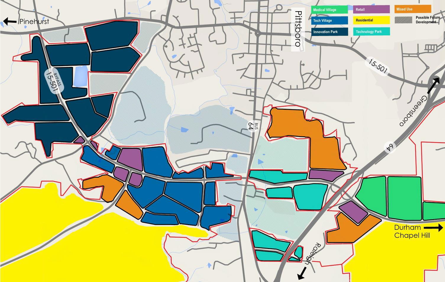 Preston Development is underway on an 8000+ acre development in Chatham County, NC, and O’Brien Atkins is excited to play a role. Preston Development approached O’Brien Atkins to help in understanding how the “work” portion of the Live-Work-Play development should be planned. O’Brien Atkins leveraged its 40+ years of experience designing facilities for Research Triangle Park companies for this engagement. O’Brien Atkins examined the major transportation bypass corridor and identified different zones that would better cater to identified types of industry. The overriding theme always being to attract cutting-edge companies, but factor in companies of different size and maturity. O’Brien Atkins helped characterize what each zone would look like, keeping in mind that Chatham Park is a Live-Work-Play development and needs to offer a broad spectrum of conveniences.