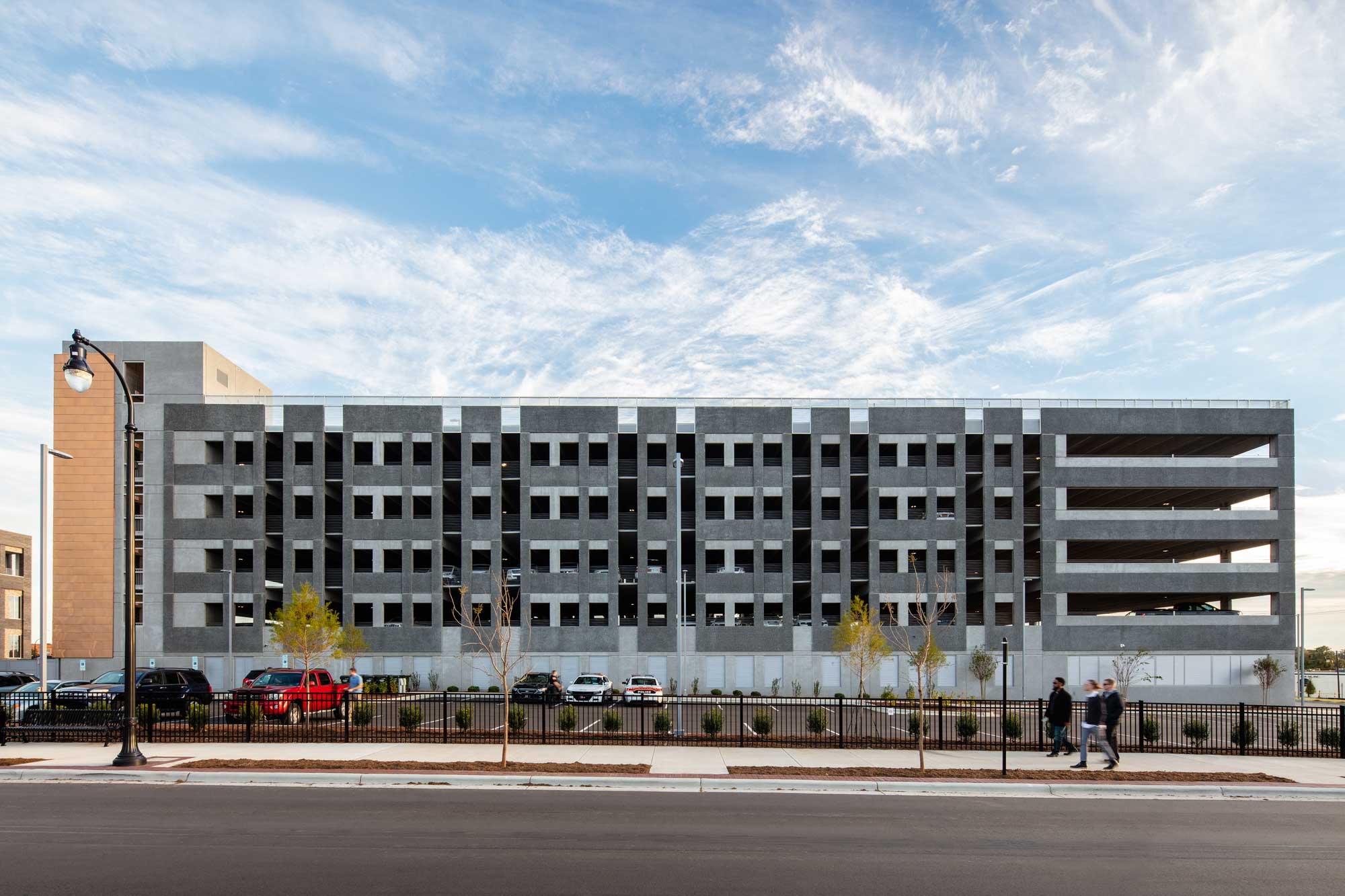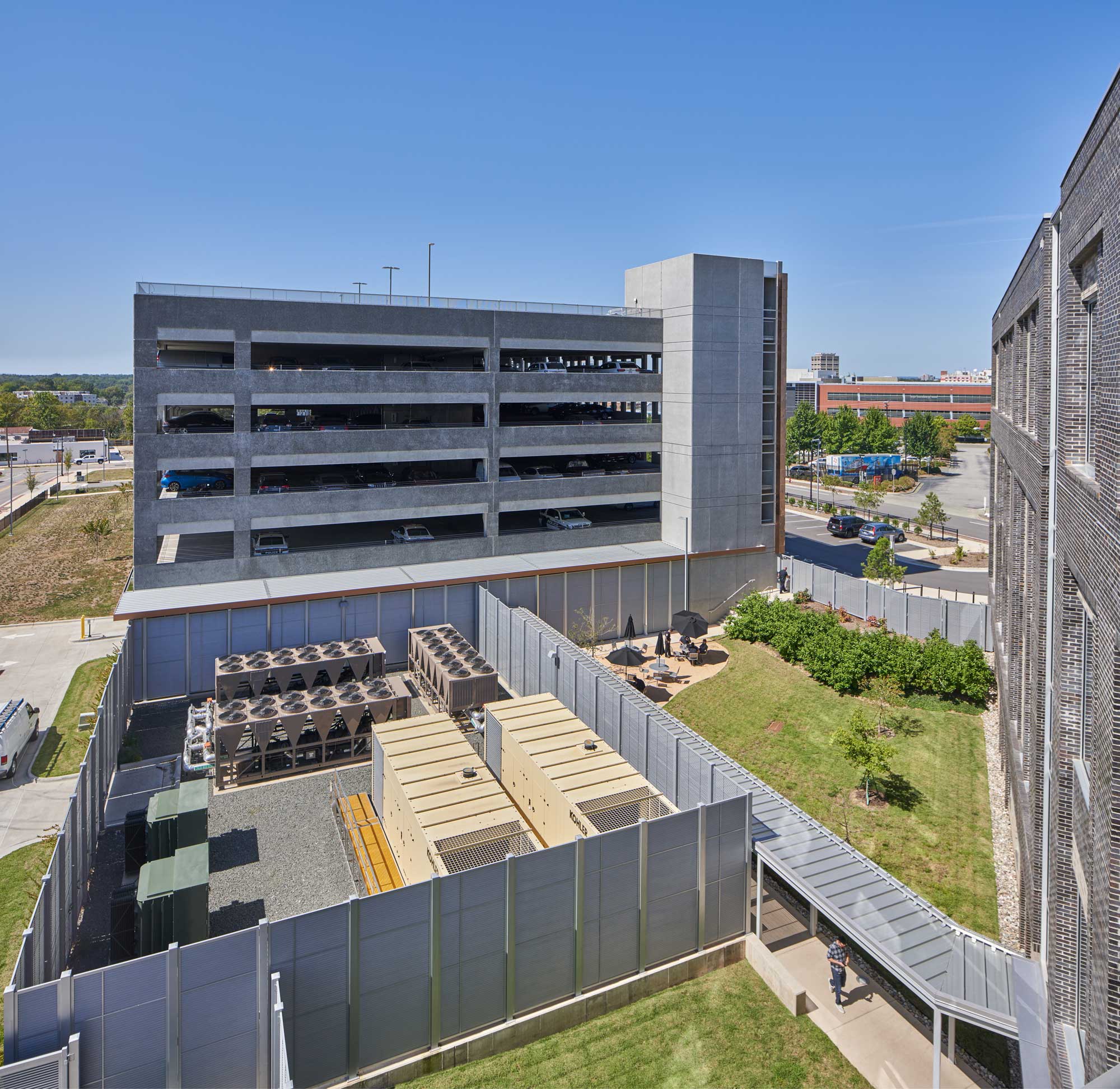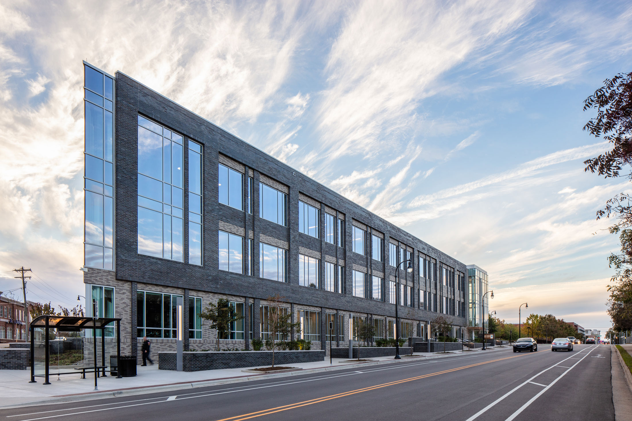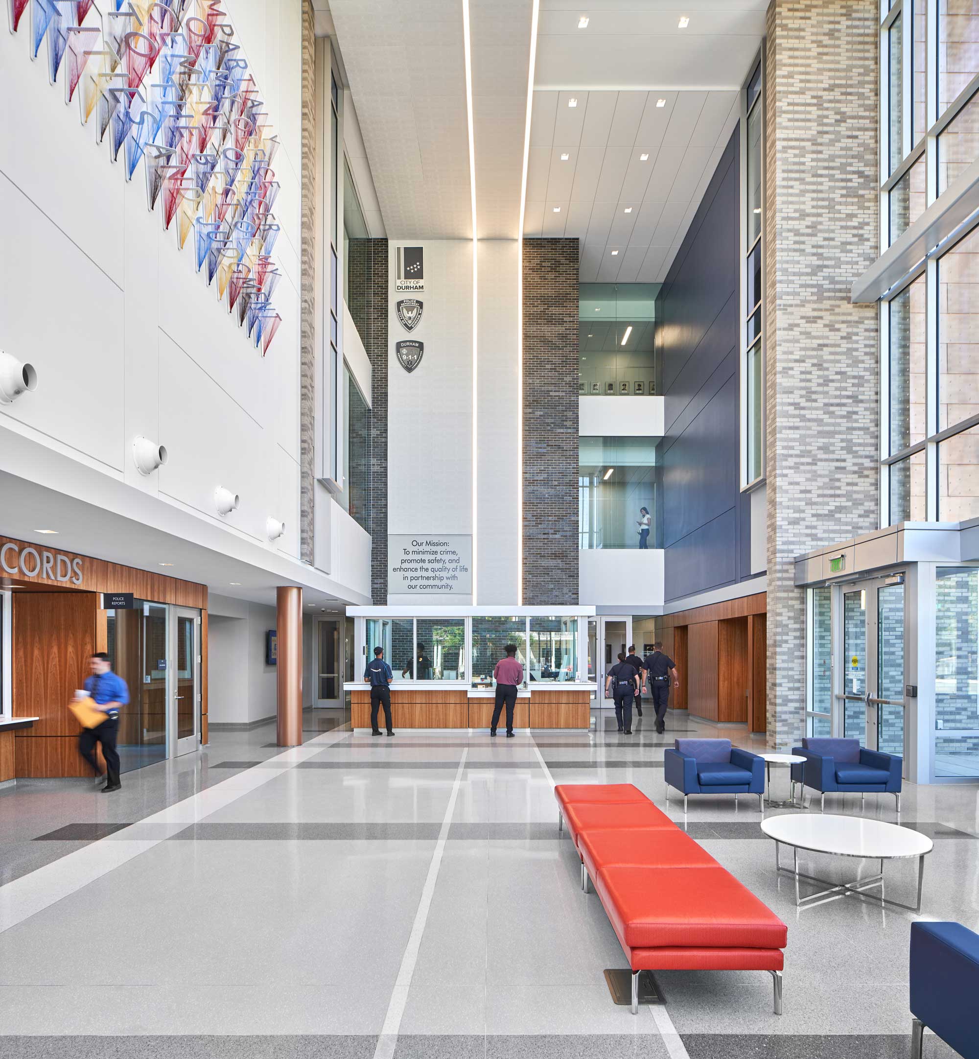 The Police Headquarters Complex is located on a 4.5 acre site in Downtown Durham. The re-development of this former industrial zone and car dealership site encompasses a new 125,000 sf headquarters building, inclusive of the 911 Emergency Call Center, a 433-car parking deck, and a 57-space visitor parking lot. The design responds to the City and community’s desire for a non-monolithic facility so as not to be perceived as a “fortress.” With the lobby/main entry on the first floor, one ascends to reach the Forensic Services Unit, Criminal Investigations Division, Special Operations Division, Crime Analysis Unit, breakroom and meeting room areas. The Chief’s office is on an upper level floor as are Professional Services, a training area and a space for “Fiscal, Accreditation, Planning.” The 911 Emergency Call Center (PSAP – Public Safety Answering Point) is a key component of this building.