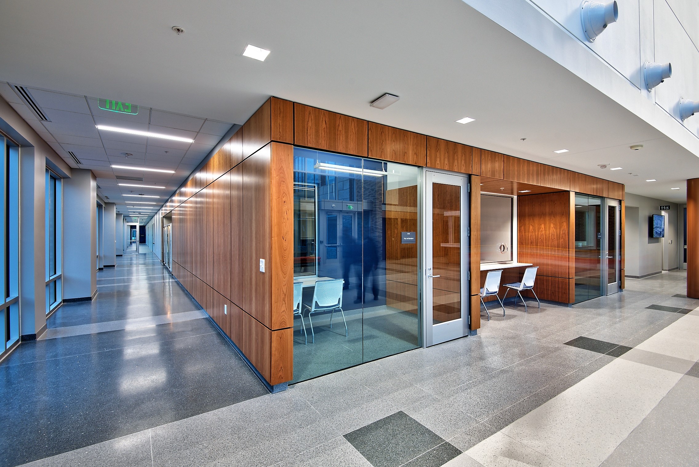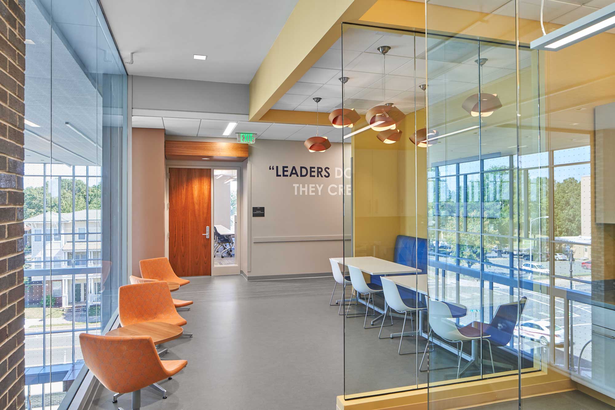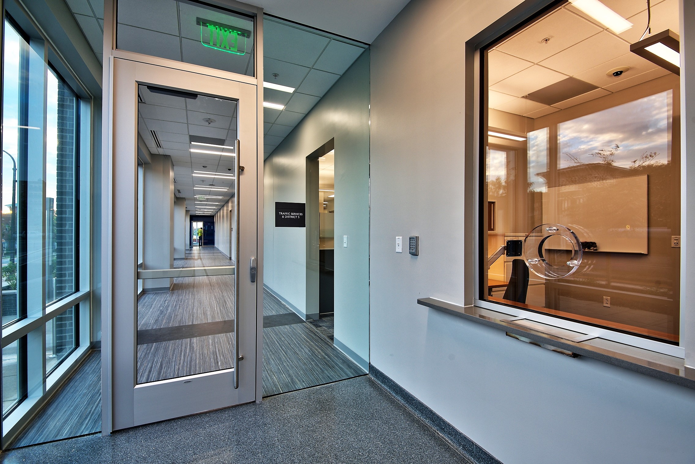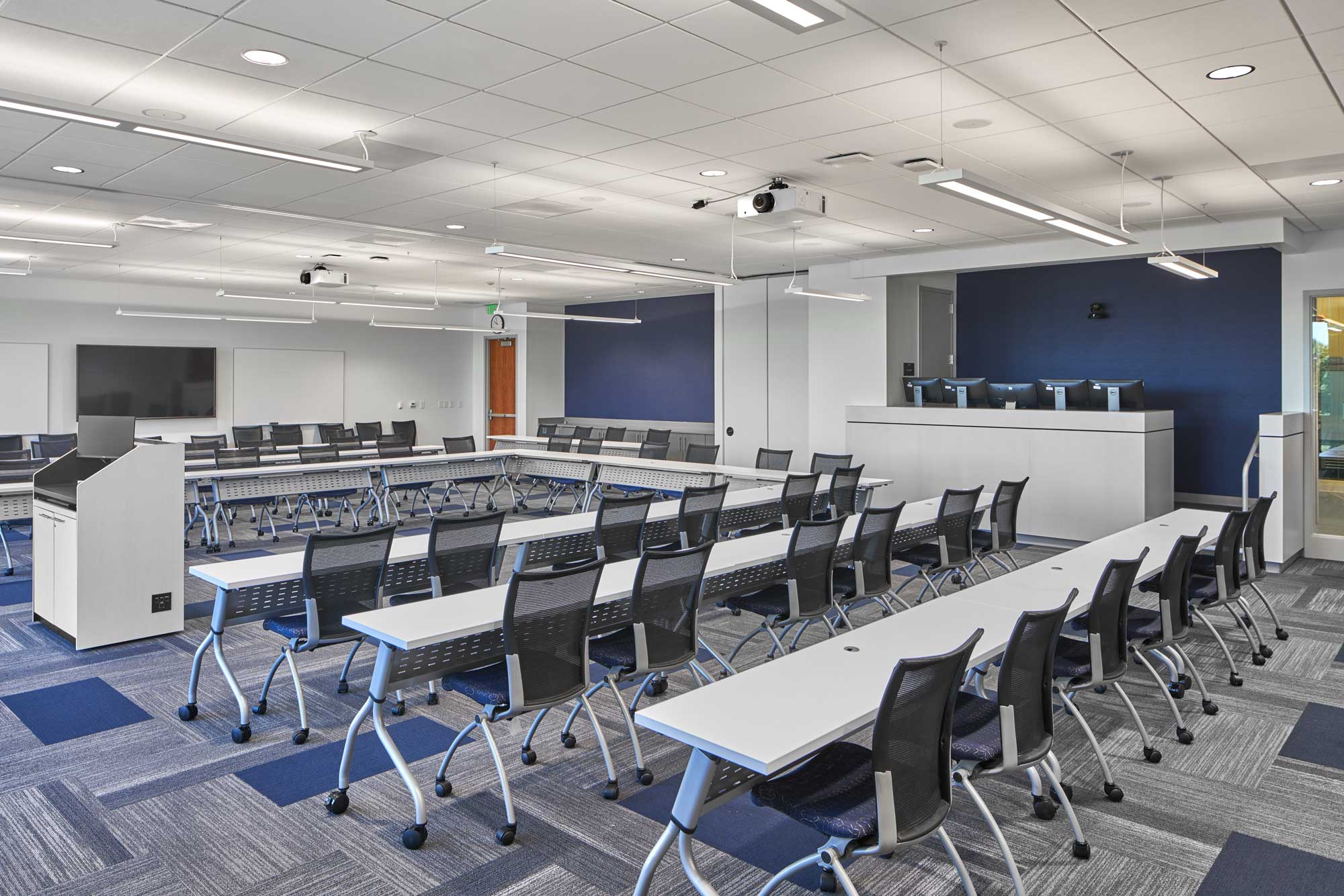 The Police Headquarters Complex is located on a 4.5 acre site in Downtown Durham. The re-development of this former industrial zone and car dealership site encompasses a new 125,000 sf headquarters building, inclusive of the 911 Emergency Call Center, a 433-car parking deck, and a 57-space visitor parking lot. The design responds to the City and community’s desire for a non-monolithic facility so as not to be perceived as a “fortress.” With the lobby/main entry on the first floor, one ascends to reach the Forensic Services Unit, Criminal Investigations Division, Special Operations Division, Crime Analysis Unit, breakroom and meeting room areas. The Chief’s office is on an upper level floor as are Professional Services, a training area and a space for “Fiscal, Accreditation, Planning.” The 911 Emergency Call Center (PSAP – Public Safety Answering Point) is a key component of this building.