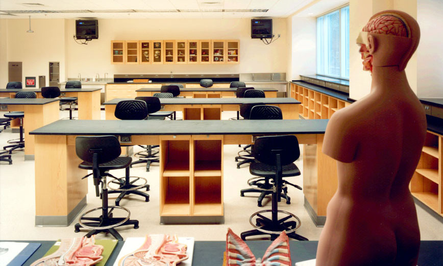Instructional laboratory space encompasses the majority of the building, with classrooms, offices, support and a library. The facility contains a 300-seat auditorium as well as a 100-seat and a 120-seat lecture hall.