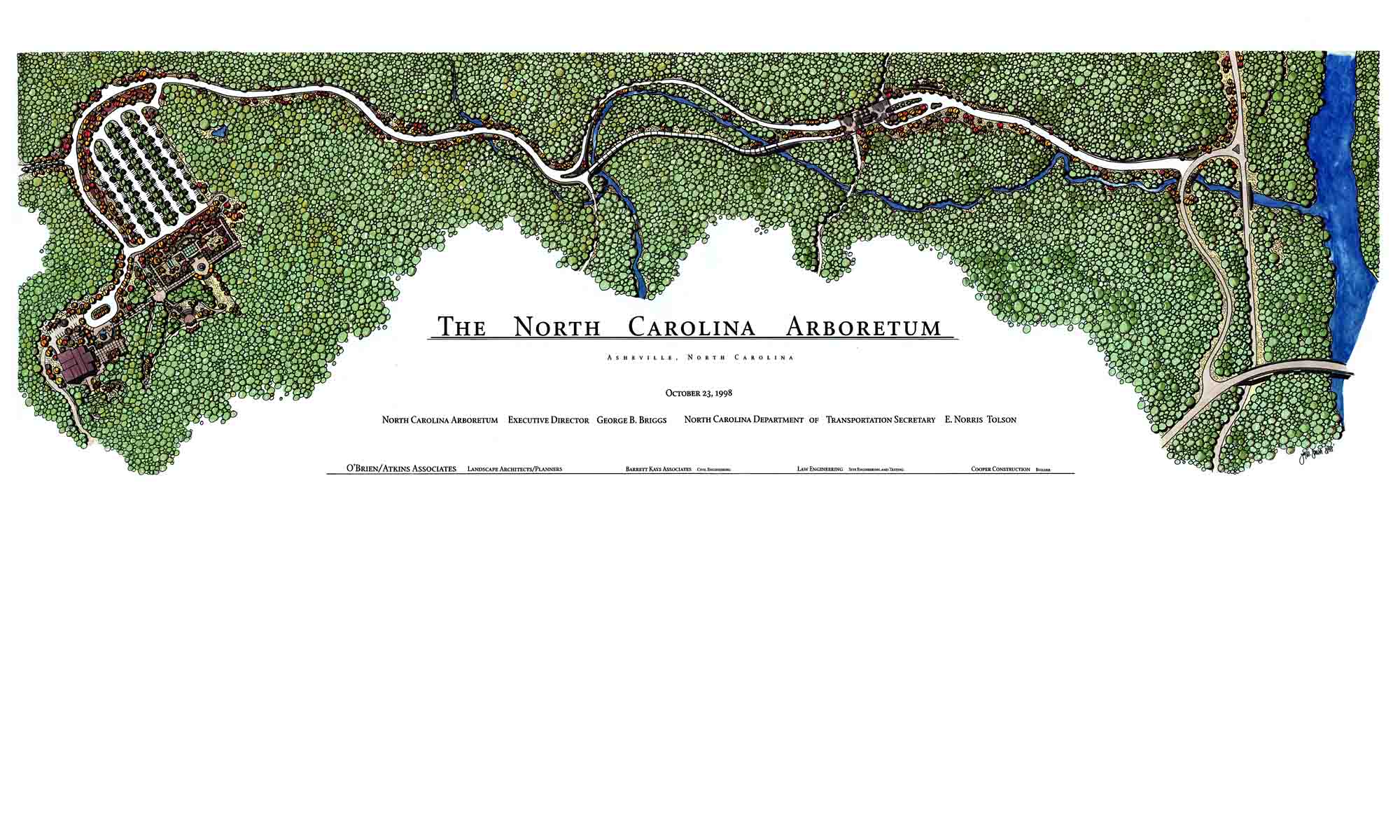 The North Carolina Arboretum is located within the Bent Creek Experimental Forest just south of Asheville and adjacent to the Blue Ridge Parkway at Milepost 393. The Arboretum was established as an affiliate of the University of North Carolina by the State General Assembly in 1986, nearly a century after Frederick law Olmsted, the Father of American Landscape Architecture, first envisioned a research arboretum as part of his legacy and plan for George Vanderbilt at the Biltmore Estate.