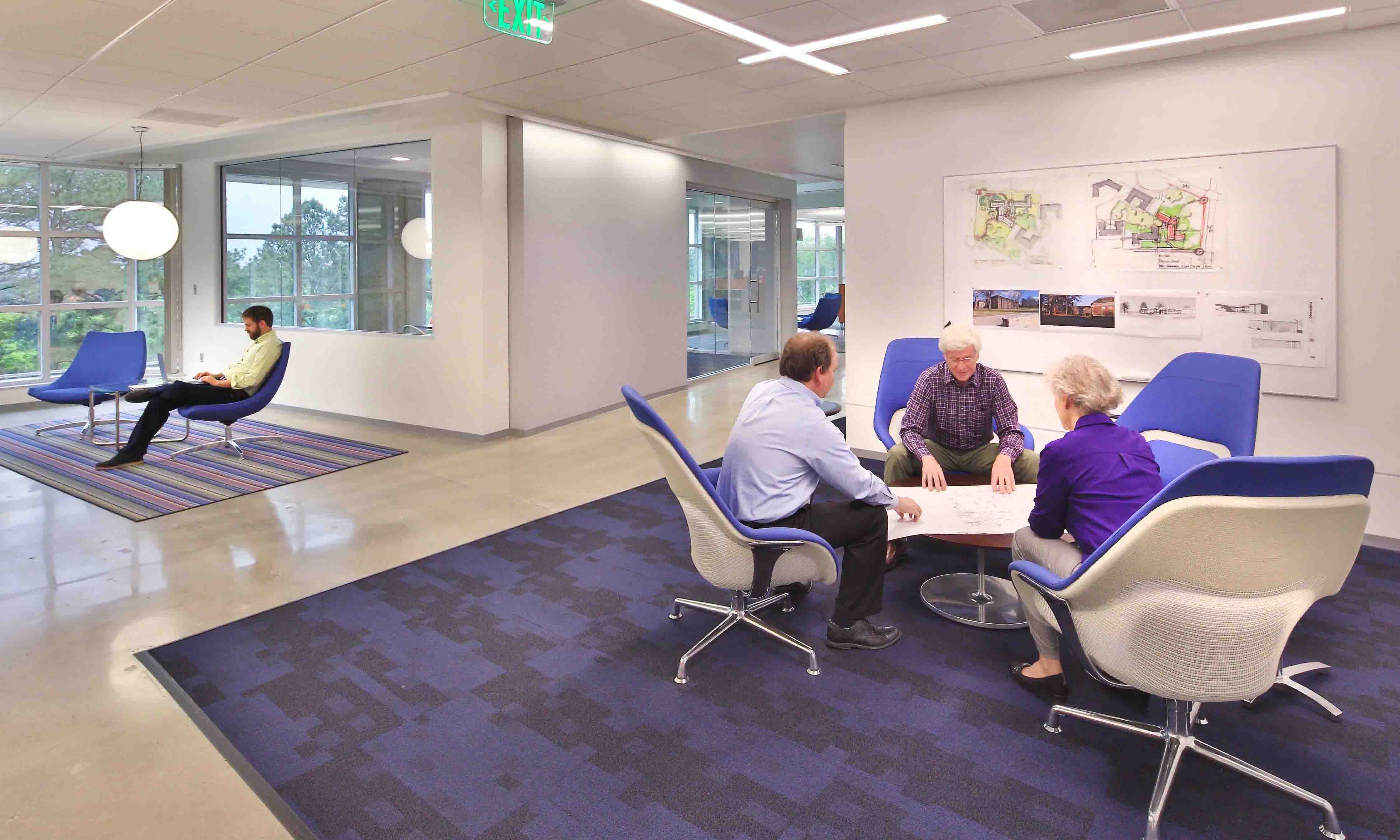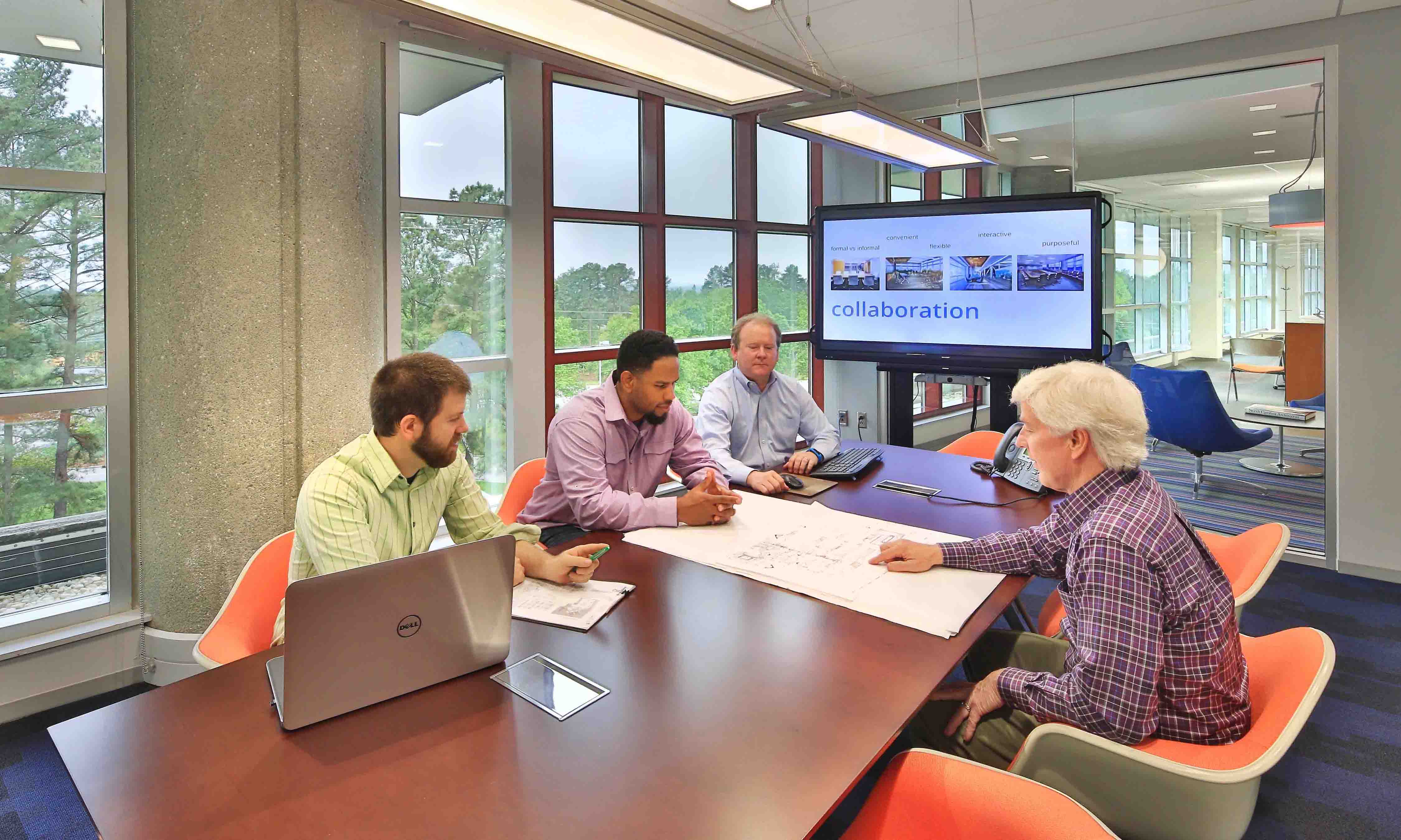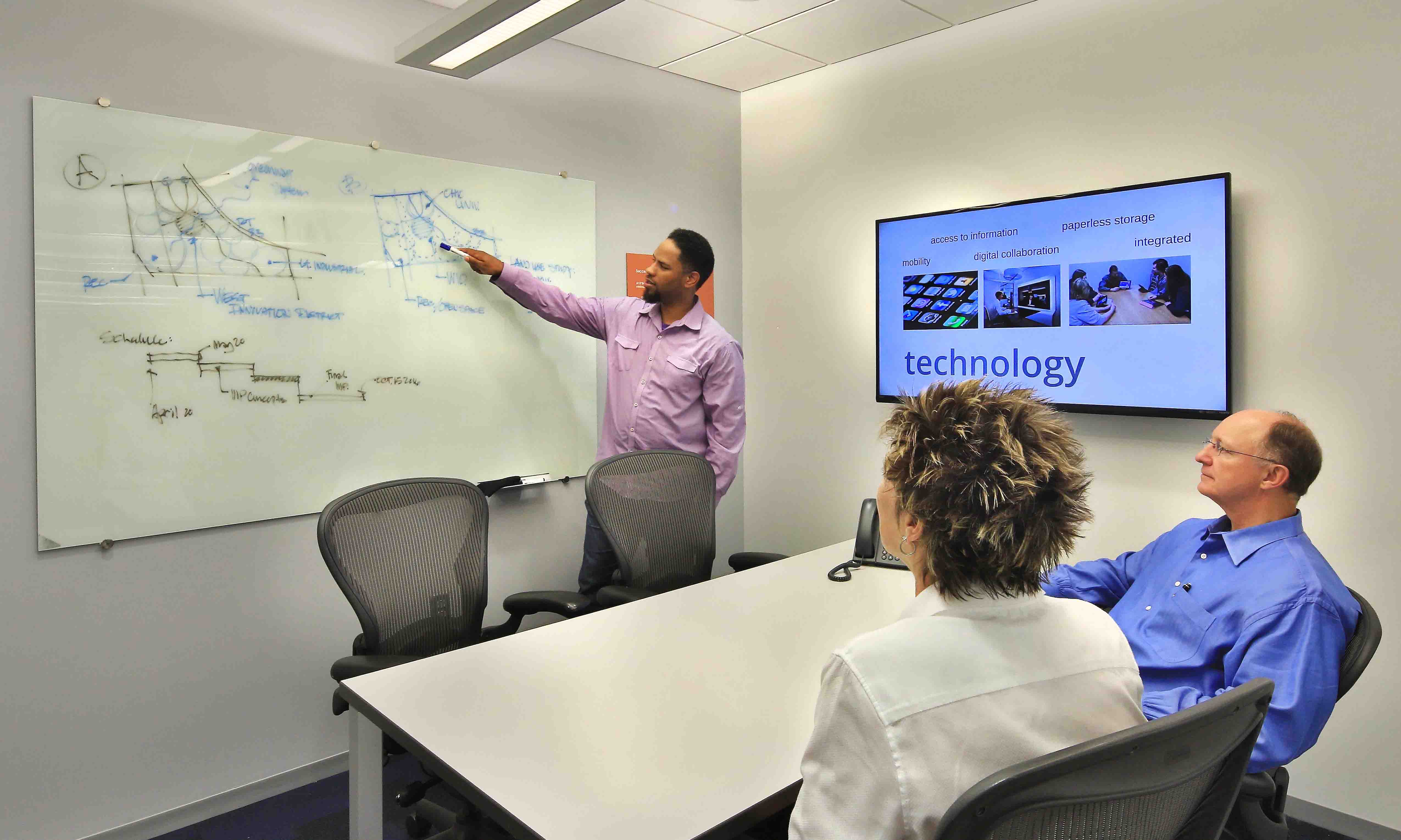 Leveraging technology was another prime design objective. State of the art technology is incorporated with large screens in every conference, collaboration and breakroom area.