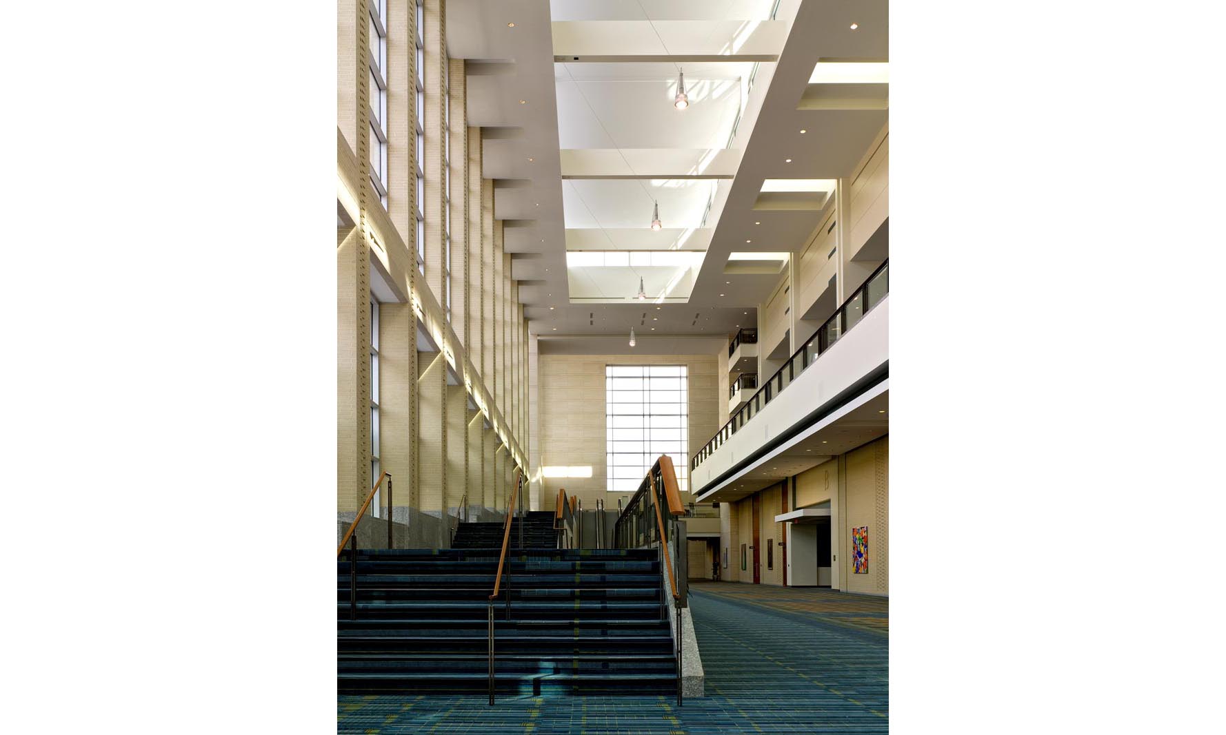 At 500,000 sf in size, and located in a prime Downtown Raleigh urban corridor, the Raleigh Convention Center houses a 150,000 sf exhibit hall, 30,000 sf of meeting rooms and a 32,000 sf ballroom. The scale of the project meets the objectives of Raleigh’s Livable Streets program by placing the exhibit hall and 14-bay truck service below grade under three city streets, and by placing elements contributing to the City’s pedestrian vitality – the public lobby and concourses – along city streets. The project’s contextual response is further enhanced by selecting its exterior palette from the enduring State Capitol and Memorial Auditorium.