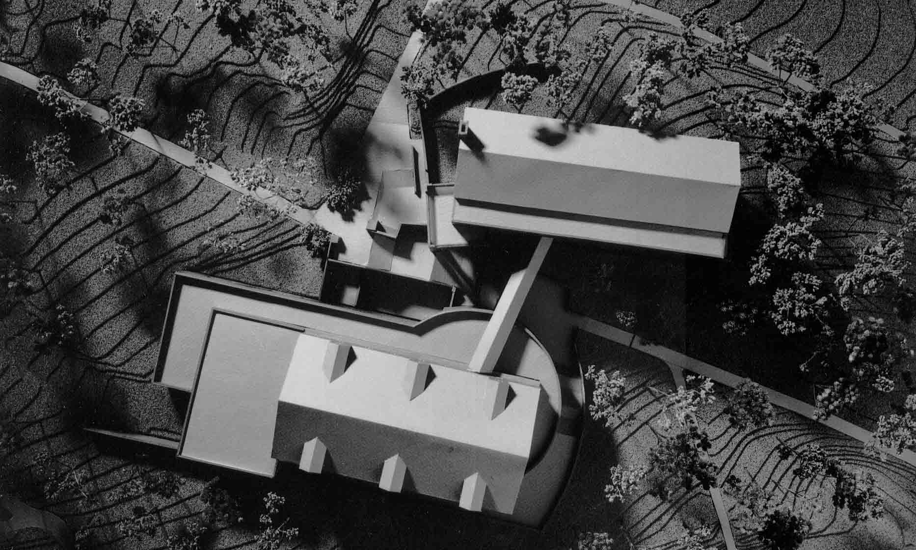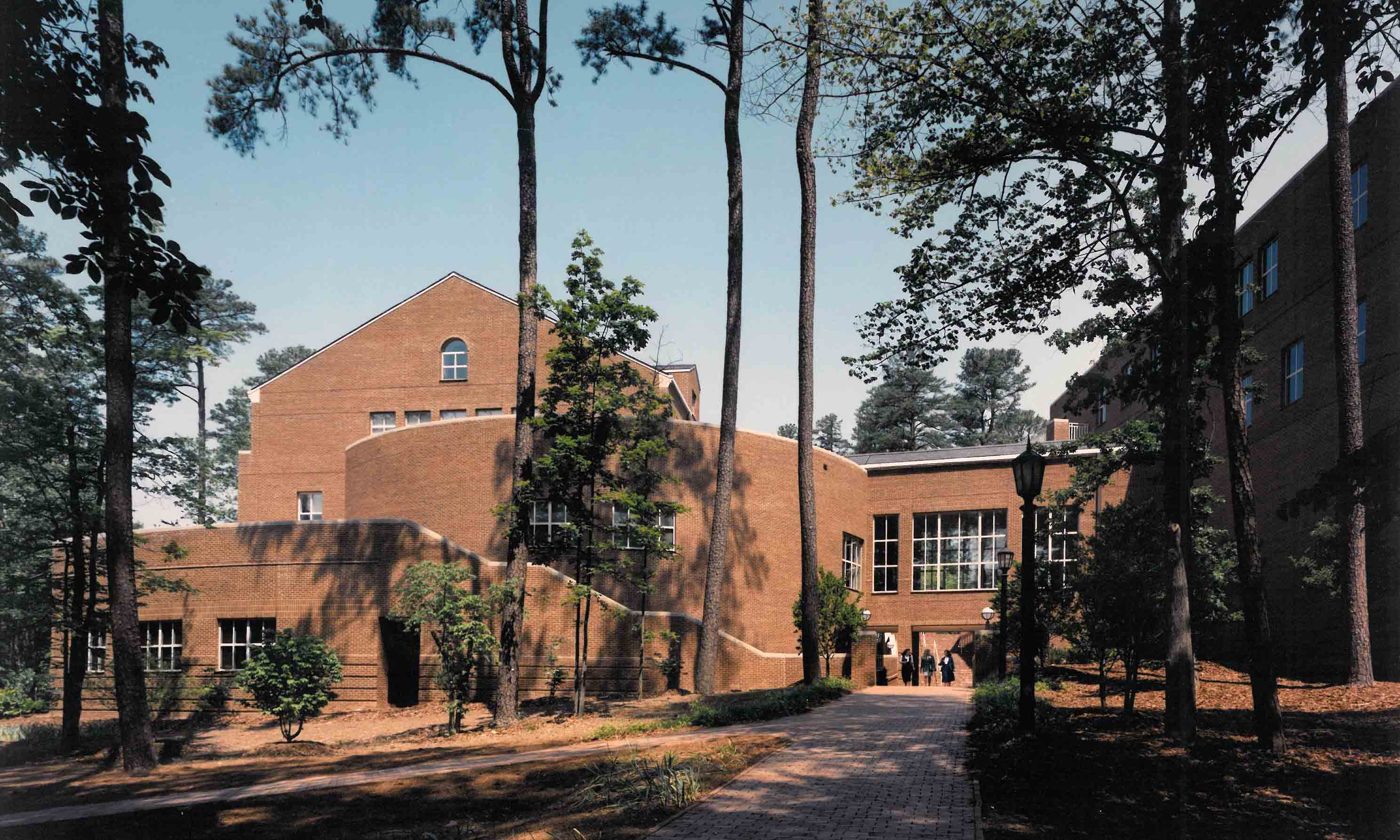 The building is located on a heavily wooded, sloping site that is situated between the football stadium and several dormitory buildings. Bisecting the site diagonally is an existing, heavily traveled campus path that is a major pedestrian route between the academic core of the campus and outlying dormitories, playing fields, and major parking areas.