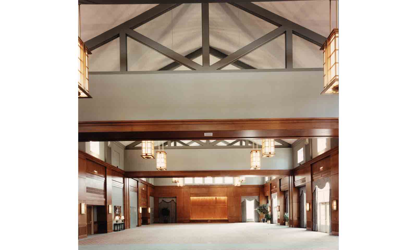 The program for the building was viewed as having two types of spaces: one included the large, public, club-like areas; the other small administrative areas and the more intimate public spaces. Conceptually, the existing path was considered as an opportunity for the alumni who are visiting the building to intermingle with students. Thus, the building straddles the existing path which becomes a plaza in and around the building. The larger, more public spaces are located on the football stadium side of the path and the smaller, more private spaces on the dormitory side.